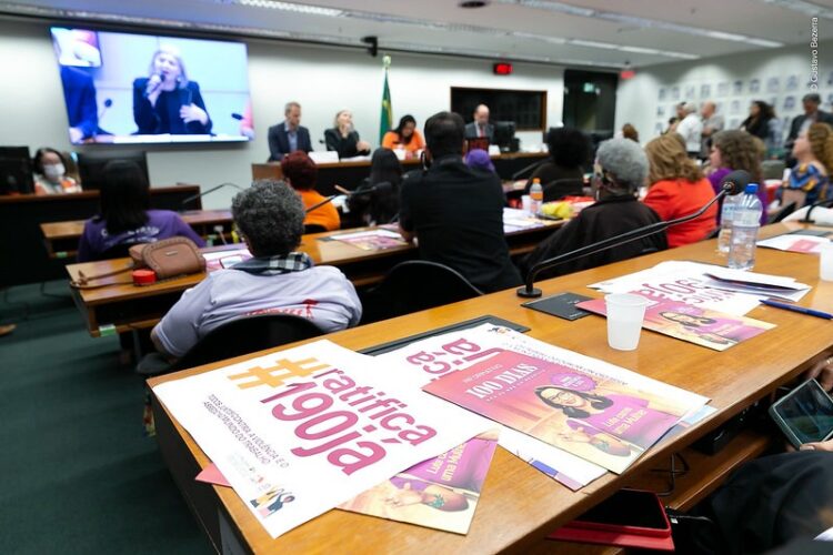 Dezenas de representantes de organizações feministas e de setores de mulheres de movimentos sindicais e sociais lotaram um dos plenários da Câmara, nesta quinta-feira (15), para exigir a ratificação, pelo Congresso Nacional, da Convenção 190 da OIT (Organização Internacional do Trabalho), que tem como objetivo combater a violência e todas as formas de assédio no ambiente de trabalho. Durante audiência pública realizada na Comissão de Defesa dos Direitos da Mulher, por iniciativa da deputada Juliana Cardoso (PT-SP), foi lembrado que o presidente Lula já assumiu o compromisso de ratificar a proposta.